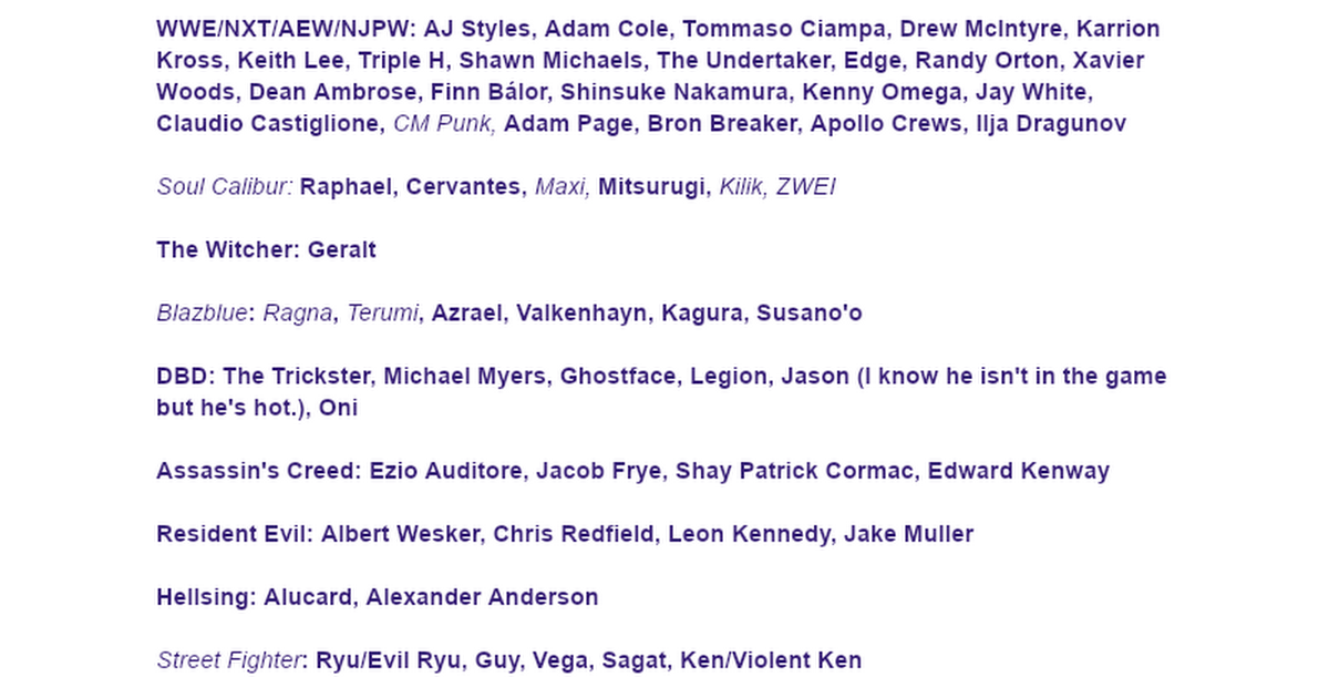 Fandoms: The Witcher, Supernatural, Marvel, various animes but mostly Jujutsu Kaisen, Subnautica, Pacific Rim, Assassin's Creed, Godzilla, Overwatch, SCP, Star Wars, Fallout, Halo, and many more