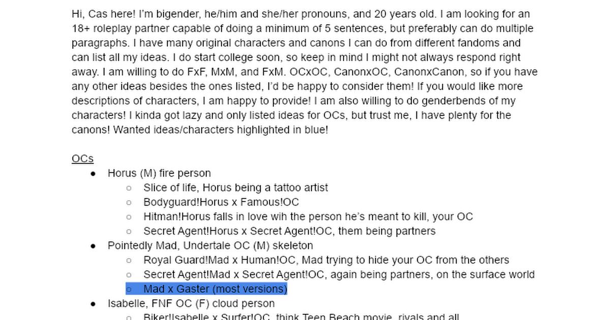 Hello everybody! I hope you're all doing swell! I'm currently looking for a gay romance with my trans OC, Alex! If you are interested, feel free to DM me!
