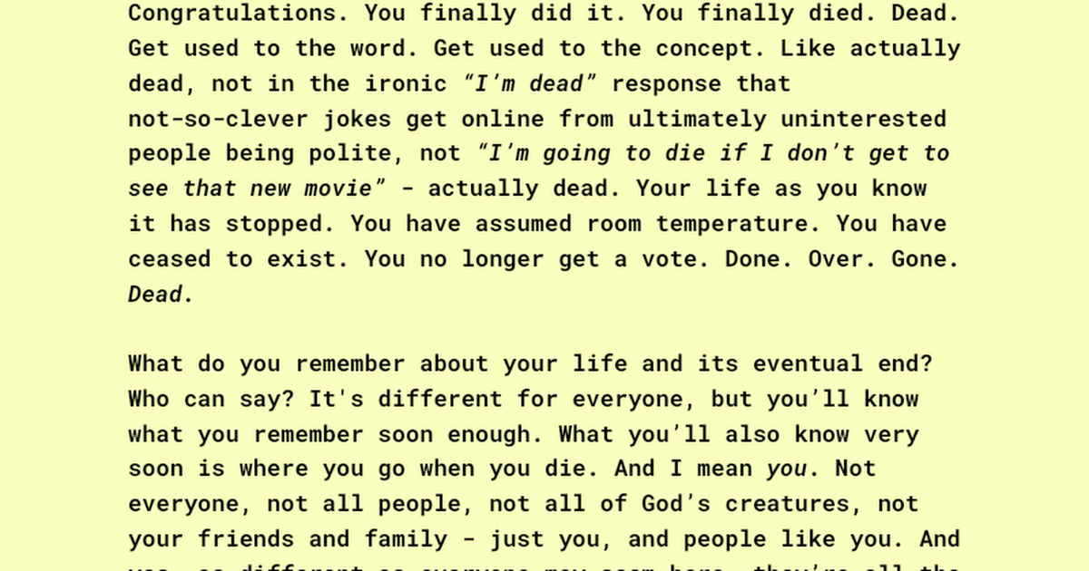 Tribulation Overview Congratulations. You finally did it. You finally died. Dead. Get used to the word. Get used to the concept. Like actually dead, not in the ironic βIβm deadβ response that not-so-clever jokes get online from ultimately uninterested people being polite, not βIβm going to die i...