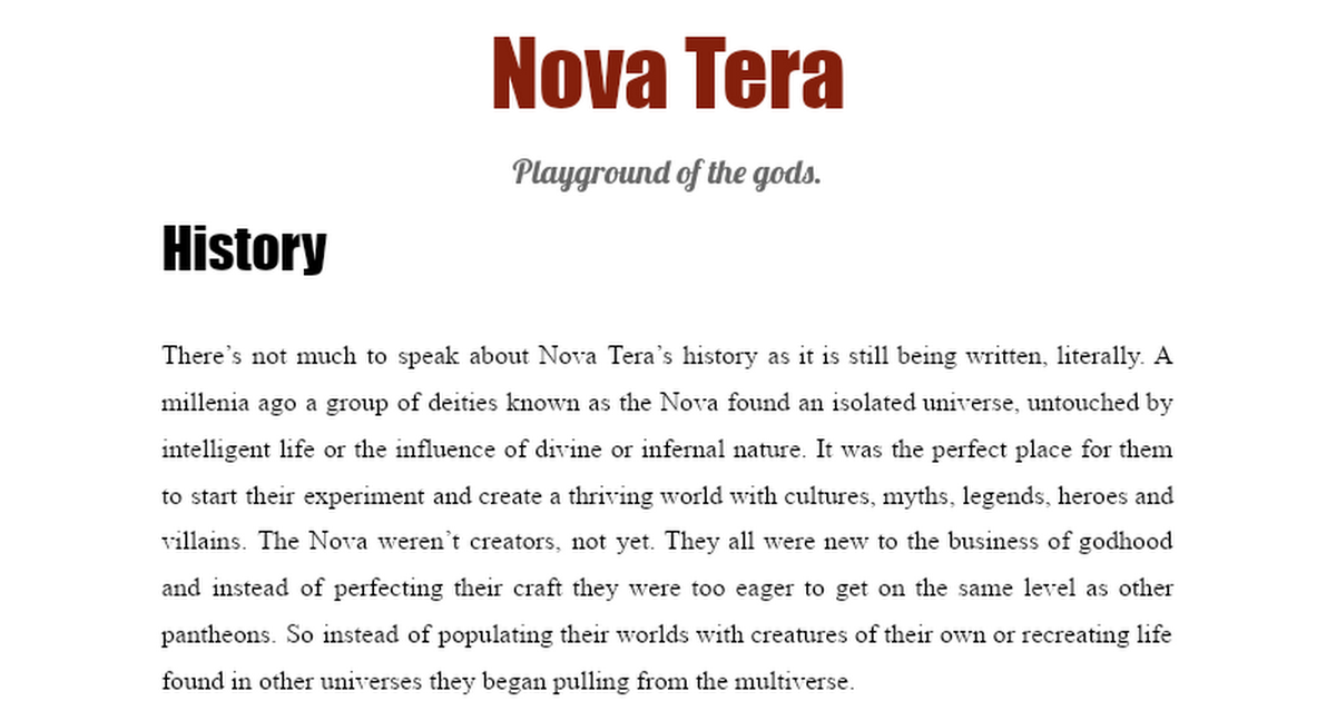 Nova Tera Playground of the gods. History There’s not much to speak about Nova Tera’s history as it is still being written, literally. A millenia ago a group of deities known as the Nova found an isolated universe, untouched by intelligent life or the influence of divine or infernal nature. It wa...