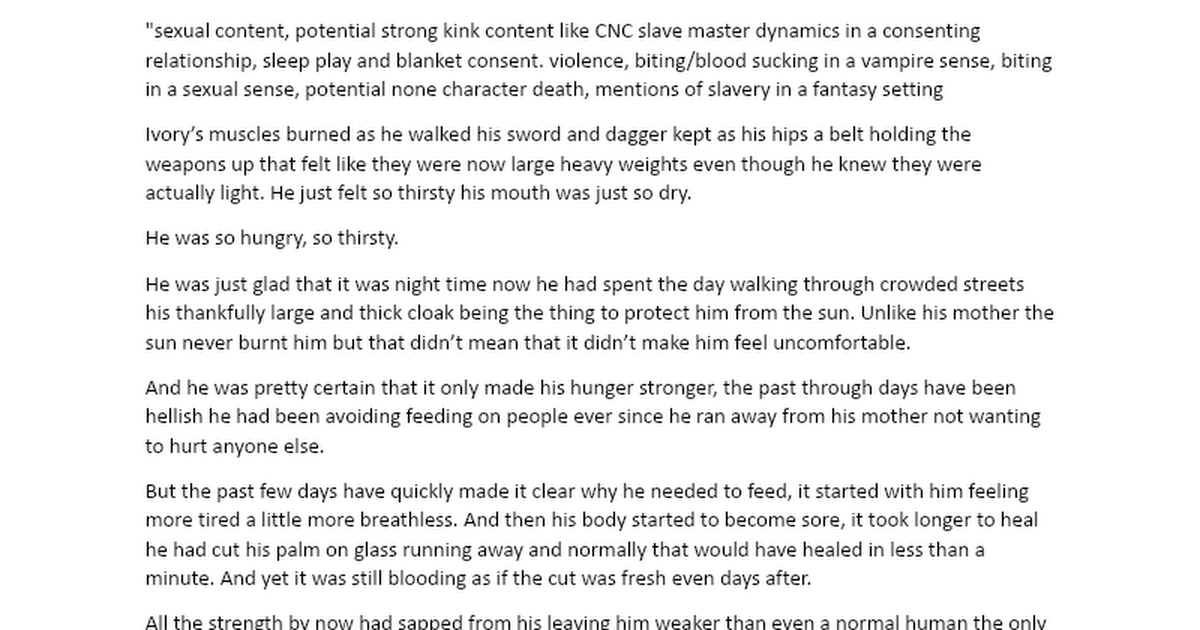 "sexual content, potential strong kink content like CNC slave master dynamics in a consenting relationship, sleep play and blanket consent. violence, biting/blood sucking in a vampire sense, biting in a sexual sense, potential none character death, mentions of slavery in a fantasy setting Ivory’s...