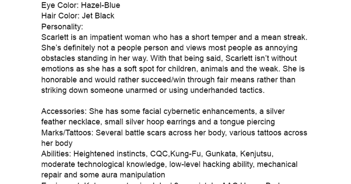 Personality: Rowan is very blunt and eccentric, but has a soft side. Once you get to know her, she is the most caring creature in the world, it’s just hard to get to that level. On the outside, she is a rough and tumble degenerate who looks out for her friends and family, one of which being Xaiden.